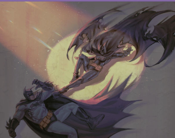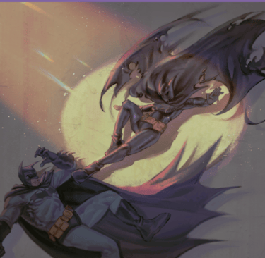 The result is a frozen instant of intensity: two forces colliding under the harsh honesty of light. Batman leans back, solid but vulnerable, while Batgirl moves with sharp agility, her form almost merging with the shadows behind her. The golden glow frames them both, turning their confrontation into something mythic—less about who wins, and more about what each represents.