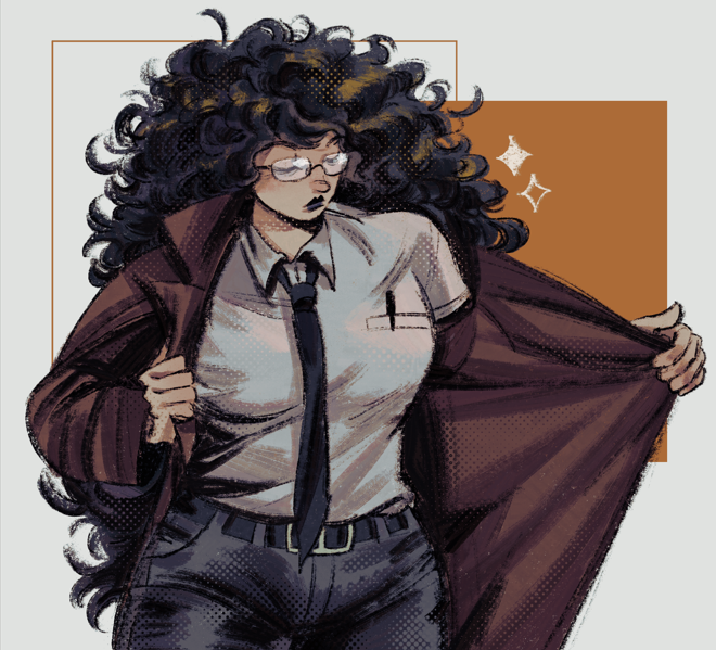 The finished illustration reads like a character card from a noir-tinged story: confident posture, purposeful costume, and an atmosphere that suggests narrative rather than explicit action. The long coat opens like body language; the glasses and curly hair give personality; the subtle color contrast (warm rim vs. cool core tones) creates depth without distracting from the figure. It’s an asset that can function as a portrait, a promo still, or a key visual within a wider campaign.