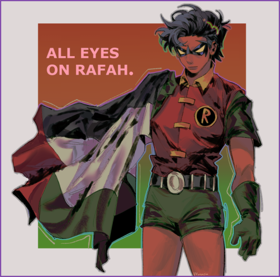 The finished piece captures Robin mid-stance, cloak unfurling like a flag in motion. The phrase ALL EYES ON RAFAH anchors the composition, confronting the viewer directly. The textures and color palette give it the immediacy of a protest poster while maintaining the polish of a digital illustration.