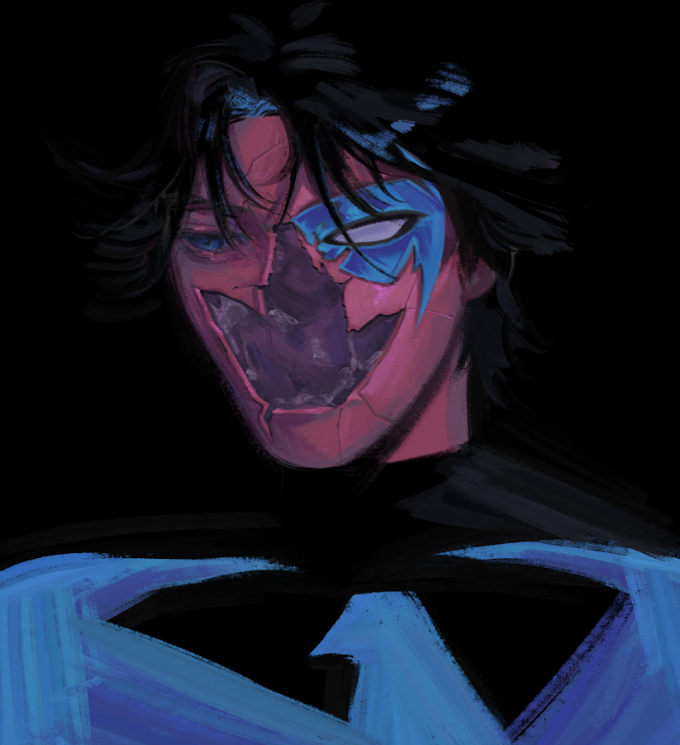 I started small: thumbnails to lock a strong silhouette and a single focal point — the eye. From there I built a simple underpainting in cool blues to anchor the figure in night, then introduced magenta and violet passes to create a bruised, nocturnal palette. The “fracture” was painted using hard-edged shapes blended into painterly textures, then layered with halftone and noise to give it a tactile, printed feel.