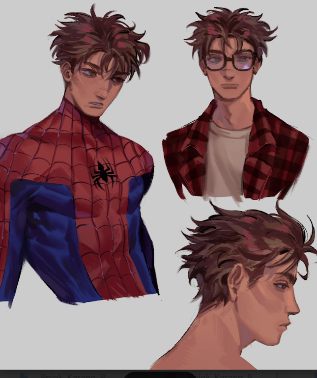 This piece functions as both character exploration and practical reference. You get the hero’s posture and suit silhouette, a civilian headshot that communicates personality, and a profile that reads like a moment of private reflection. Together they tell: this is someone who jokes, worries, and chooses to stand up anyway. The treatment is useful for concept development, pitch visuals, or as a reference for animation and comics.