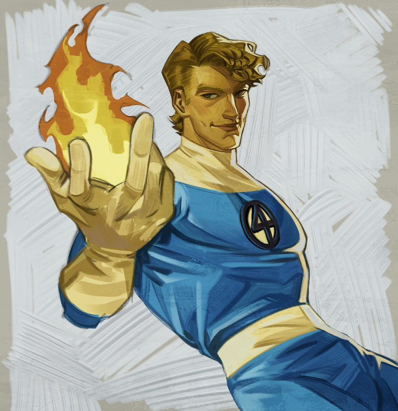 For the flame I used warm passes with additive highlights and a soft bloom layer; for the suit I worked cooler blues with midtone modeling and subtle cross-hatching to keep the fabric tactile. The background is intentionally sketchy — rough strokes and halftone textures give the piece a printed-poster feeling and let the figure remain the star.