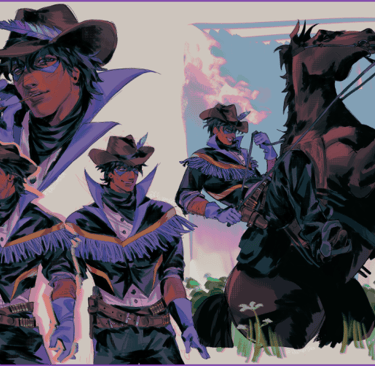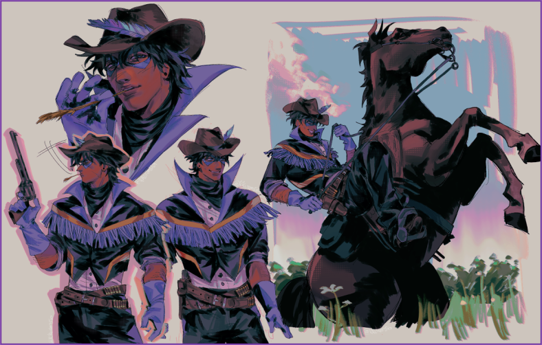 I focused on silhouettes first so the design reads instantly from distance: the hat + mask combo keeps his hero identity intact; the slim, athletic posture keeps his acrobatic feel. Color-wise I kept cool blues and teals as the core to echo his classic palette, then introduced warm magenta rim-lights and golden highlights to place him in a sunlit dusk environment. For texture and mood I used halftone dots and painterly brush strokes to give the piece a tactile, poster-like quality. Lastly, I painted a dynamic study of him riding a rearing horse — a single-frame story beat that sells the world and the character in one image.