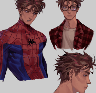 I wanted to show the same person in three different truths: the awkward, thoughtful kid behind the glasses; the tired, determined hero under the mask; and the private profile that holds his doubts. The challenge was to keep all three reads clearly Peter Parker—not just three pretty heads—so the sheet would feel like a single character study rather than random portraits.