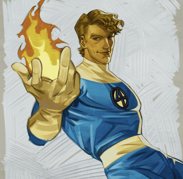 I started with small thumbnails to lock the dramatic foreshortening and the camera angle — the hand had to dominate without swallowing the character. From there I built the piece in layers: underpainting for form, block colors for flame vs suit, then lighting passes to define planes.